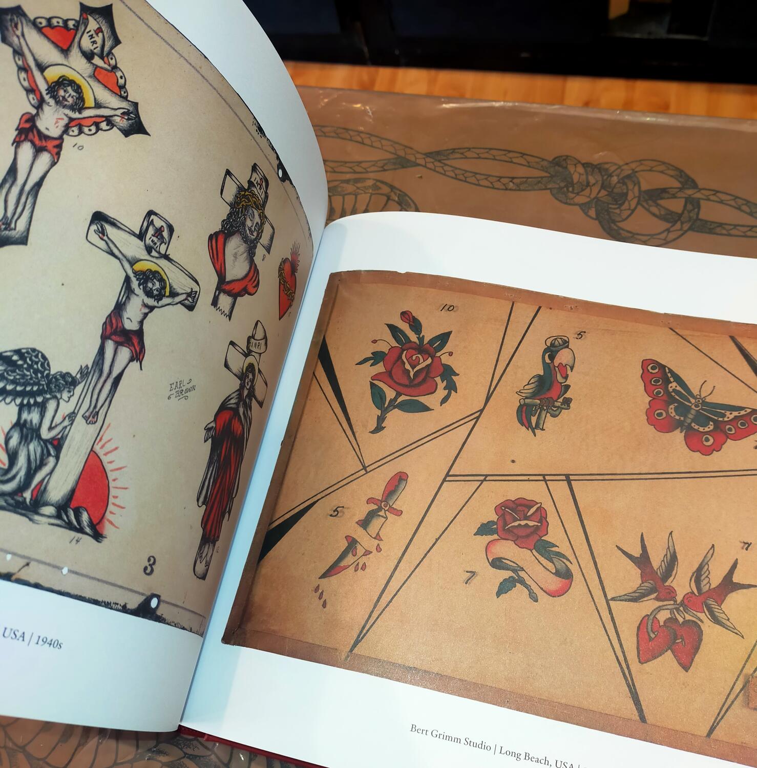 The books trace the evolution of tattoo art from the early 1900s Bowery in New York to the mid‑century Pike in Long Beach, California, and beyond. Each page immerses you in the vibrant world of vintage tattooing, with rare original flash by legends such as Bert Grimm, Bob Shaw, Earl Brown, Paul Rogers, Tahiti Felix, Zeke Owen, Tex Rowe, Ted Inman, Ed Smith, Sailor Barney, Ace Harlyn, Tattoo Lou, Tattoo Peter, Jack Dracula, Wes Grimshaw and many others.