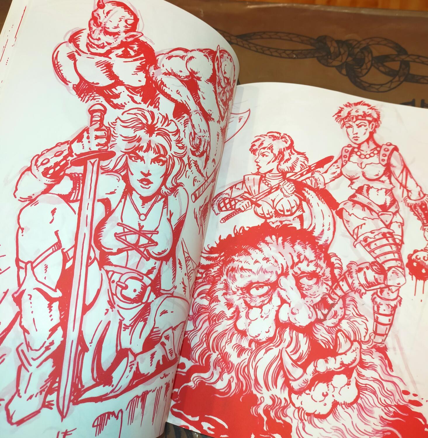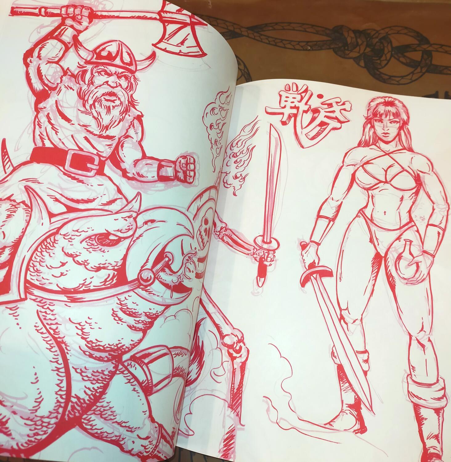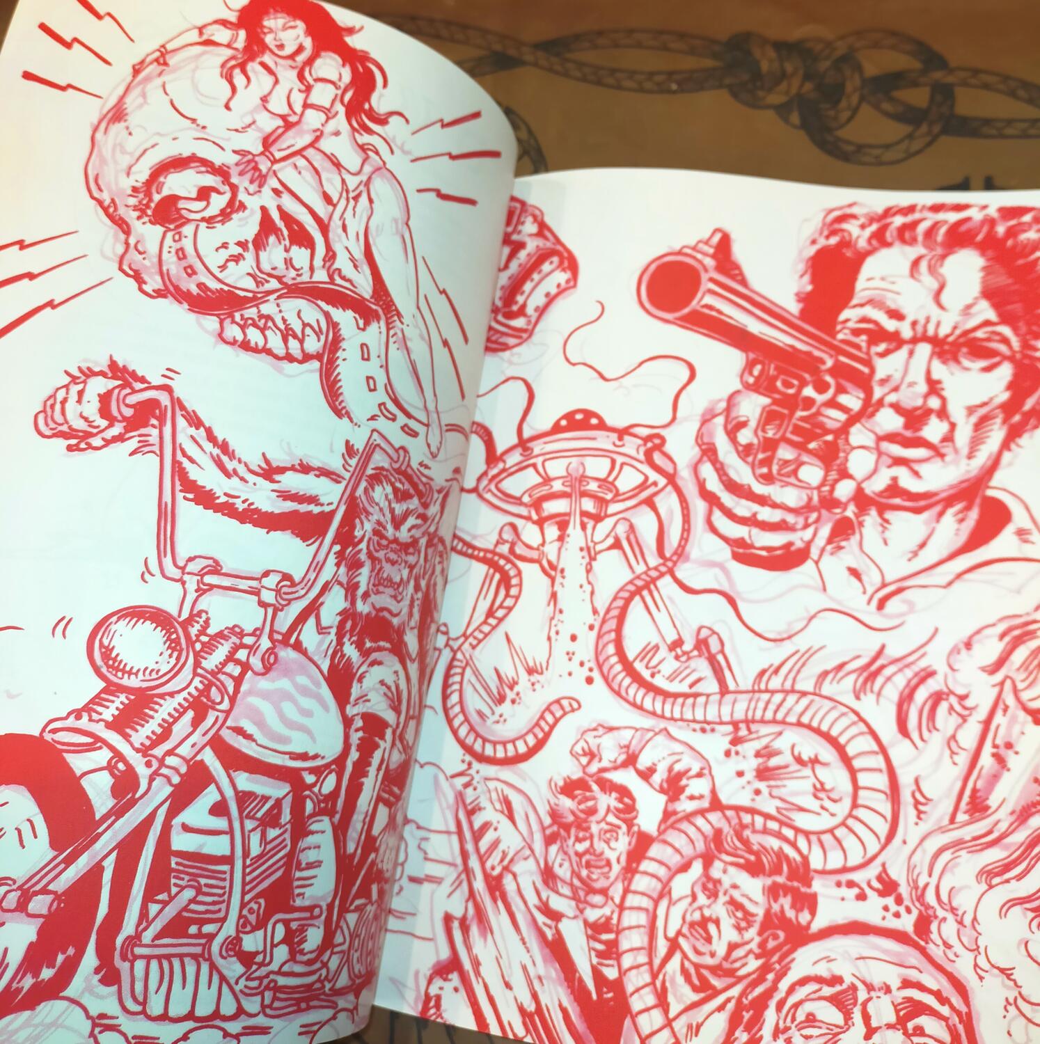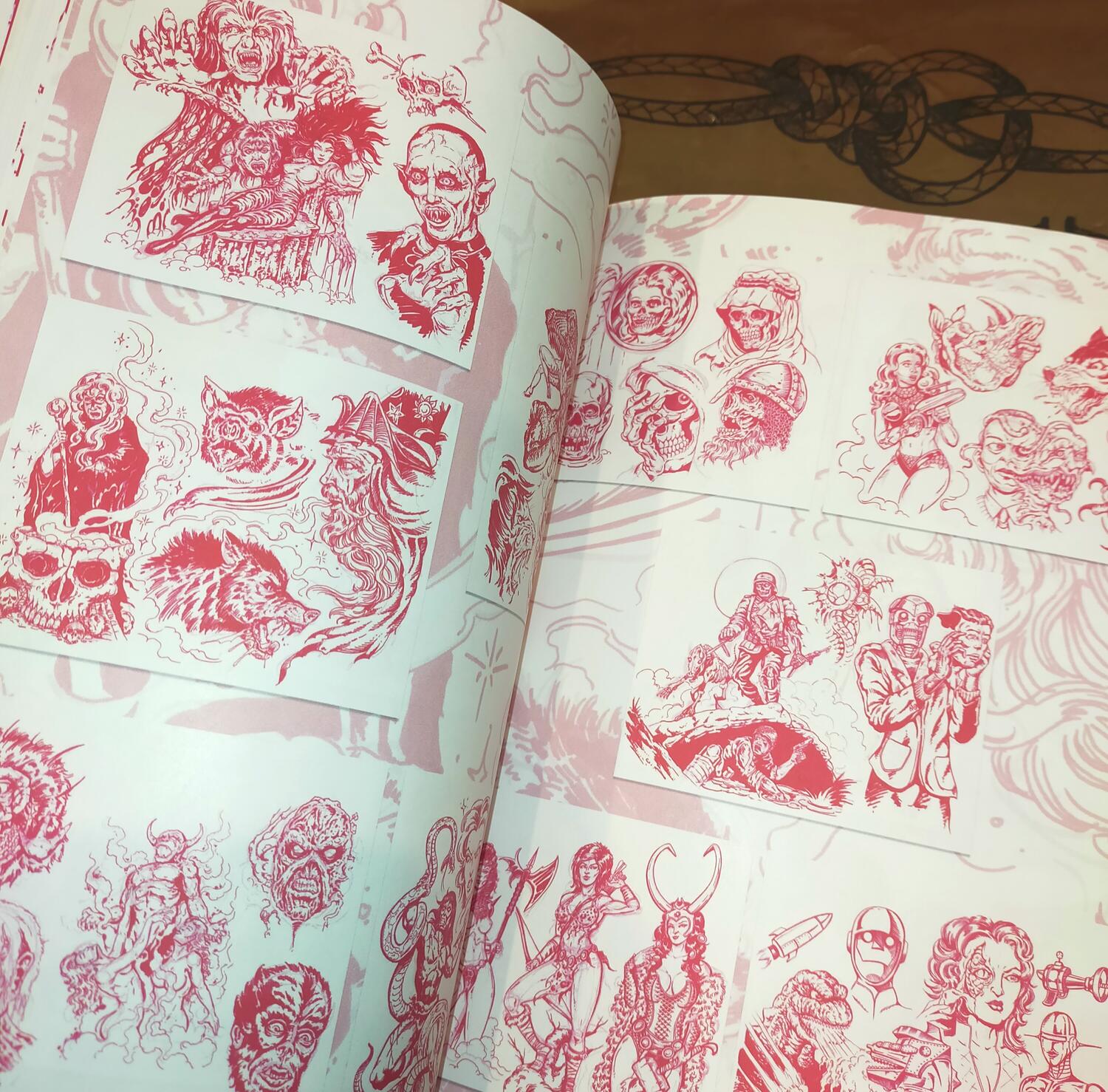 This 90-page sketchbook is packed with dynamic red ink sketches, perfect for tattoo artists, illustrators, and designers seeking bold inspiration.